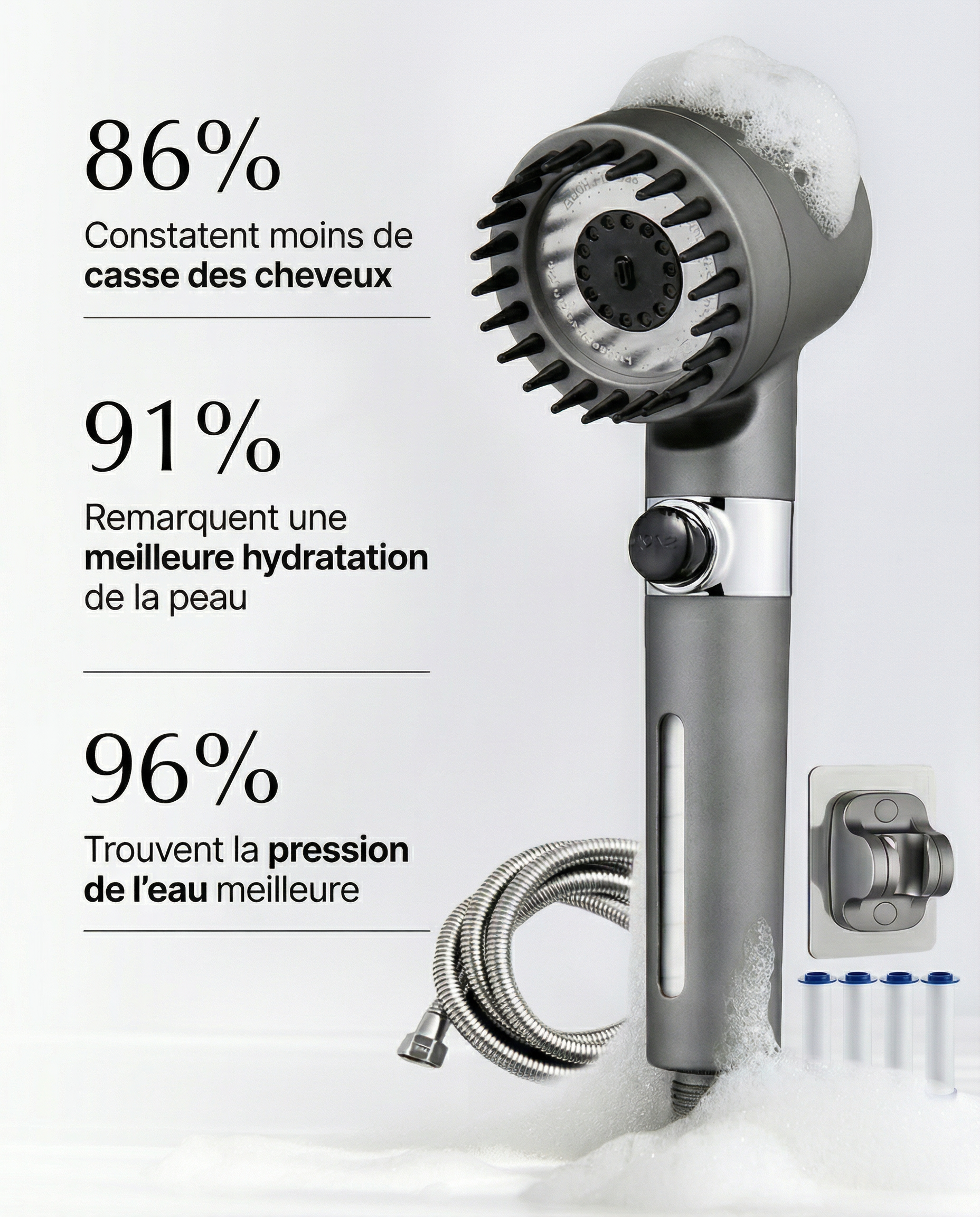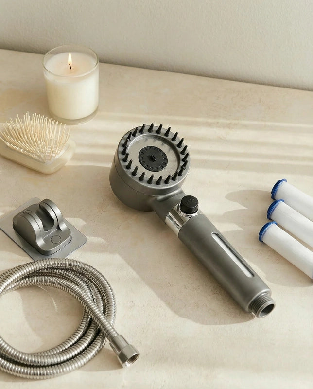Notre système de filtration avancé, testé en laboratoire, est conçu pour éliminer efficacement le chlore, les sédiments, les métaux lourds et autres impuretés présentes dans l'eau du robinet. Il assure une eau plus propre pour une peau et des cheveux visiblement plus sains et hydratés.